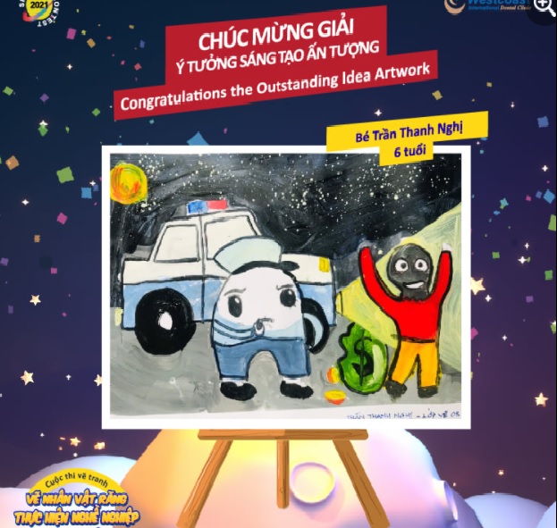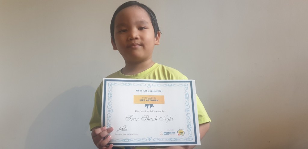 Vừa qua, sau hơn một tháng phát động, cuộc thi Smile Art Contest 2021 do Nha Khoa Westcoast tổ chức đã tiến hành lễ trao giải cho các thí sinh đoạt giải. Bé Trần Thanh Nghị, 6 tuổi, học viên của Lớp vẽ OS, đã xuất sắc giành giải Ý tưởng Sáng tạo tại cuộc thi này.