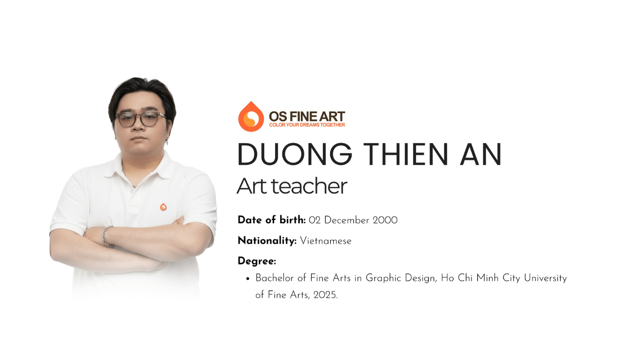 About: Mr. Duong Thien An is a designer and a dedicated art educator with extensive experience in teaching specialized courses, particularly in Watercolor and Figurative Drawing. He upholds the teaching philosophy: “I aim to cultivate an accessible artistic environment where learning is open to all. My goal is to foster independence, ensuring students do not become overly reliant on instructors but instead develop self-study methodologies and the capability to refine and complete their artworks autonomously.” Mr. Thien An joins OS Fine Art Center as an art instructor, specializing in: watercolor painting, study abroad art portfolio preparation, academic drawing (focusing on plaster bust and portrait drawing for entrance exams), Decorative color composition, sketching.